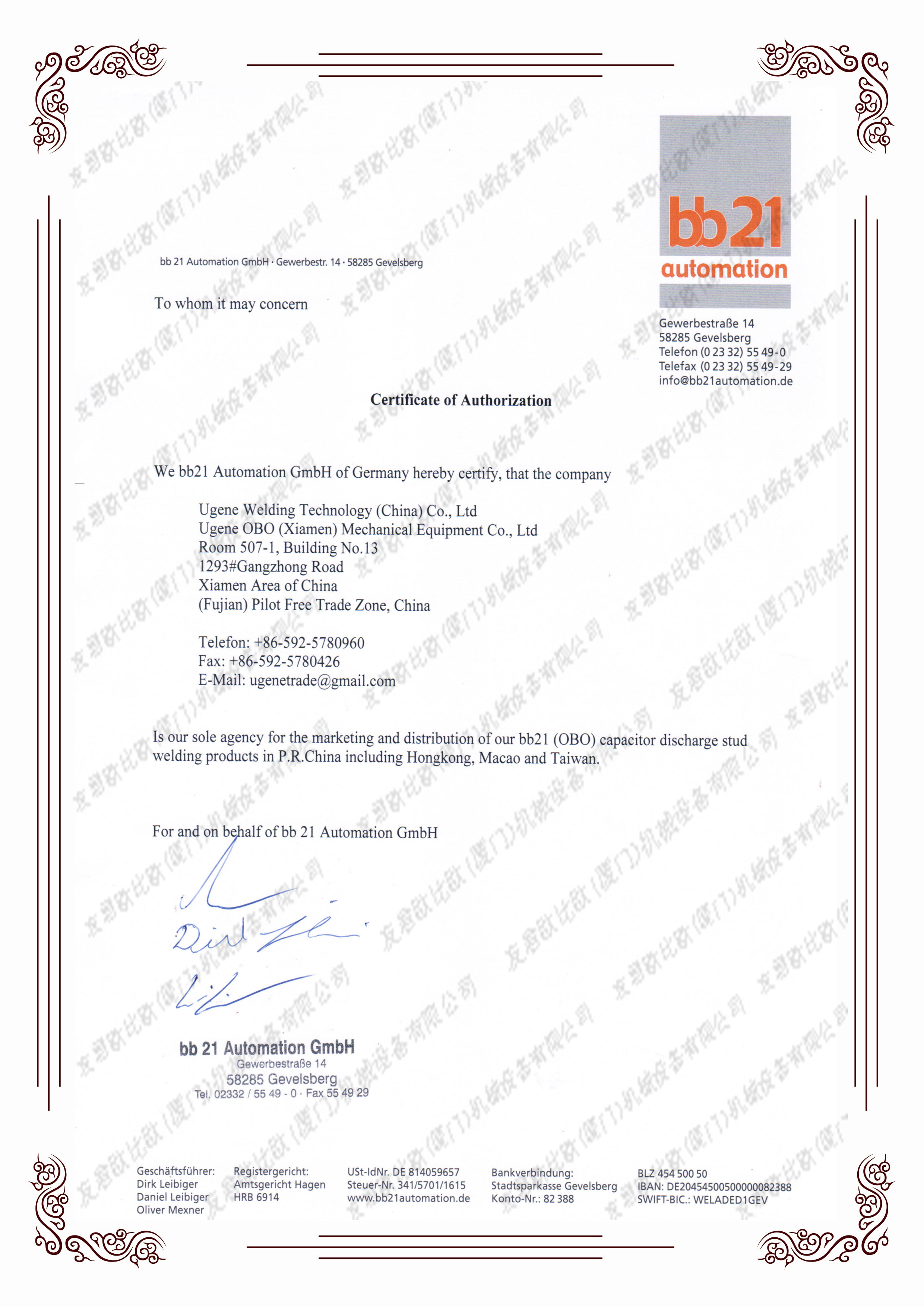 德國bb21螺柱焊機中國代表處-友君歐比歐(廈門)機械設備有限公司, 電話:0592-5780960 0592-5780426 傳真:0592-5780426